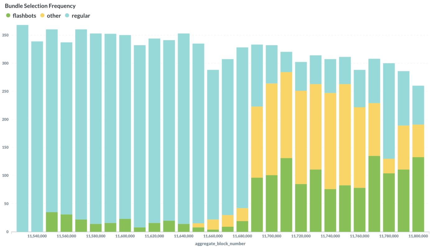The following graph shows all the blocks mined by Flashbots miners over the course of the month. The breakdown of the blocks mined by the participating mining pool shows how frequently Flashbots blocks (green), which are blocks mined with Flashbots transaction bundles, are more valuable than regular blocks (blue).